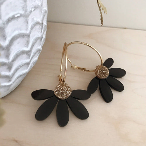 Jumbo Daisy Hoop Earrings | Black + Gold Glitter |