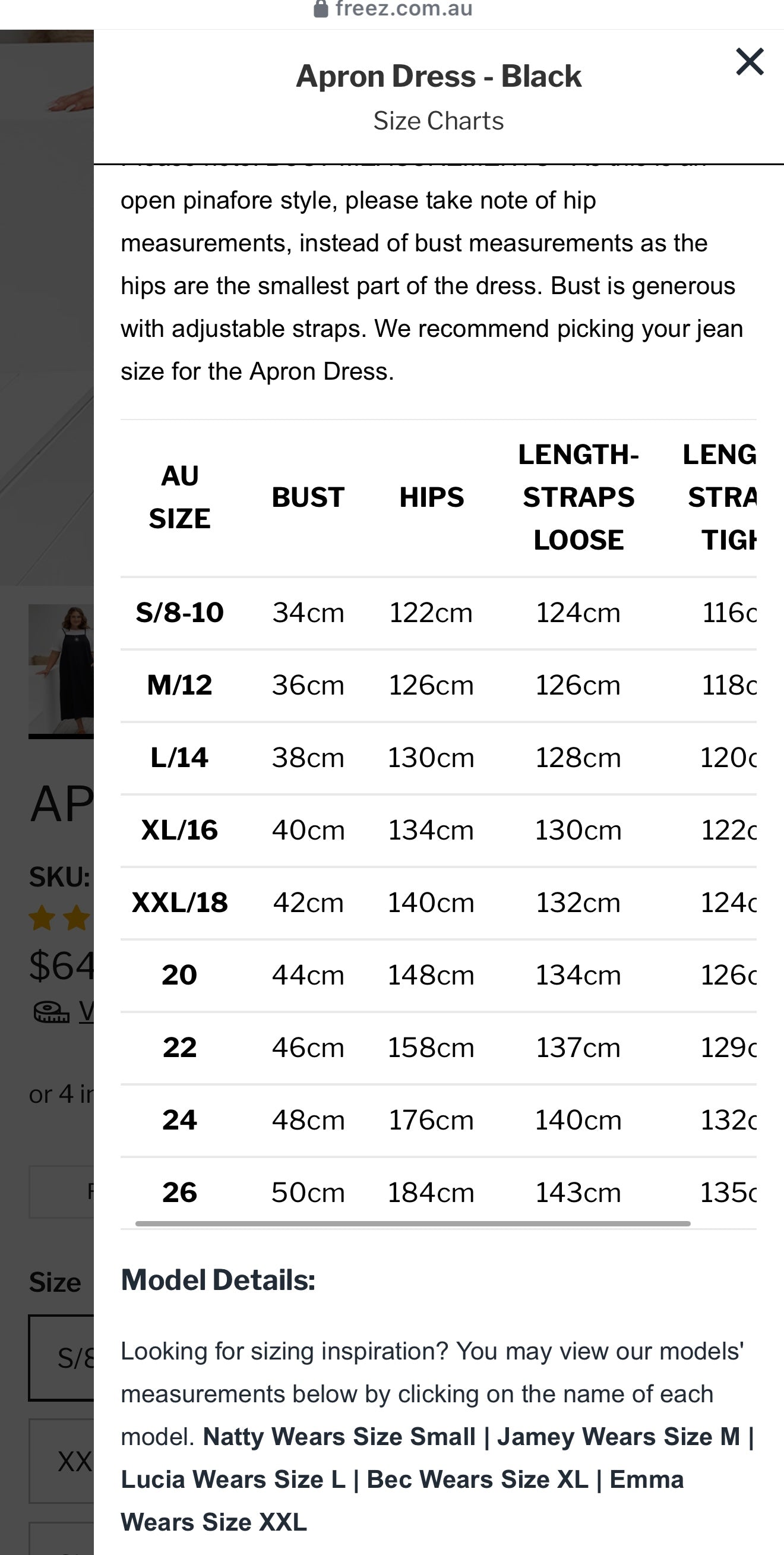 FIT: Please note: our Denim Apron Dress is a different fit to our original Apron Dress. As it is a stretchy denim, we would recommend downsizing in the Denim compared to your sizing in the original Apron Dress.