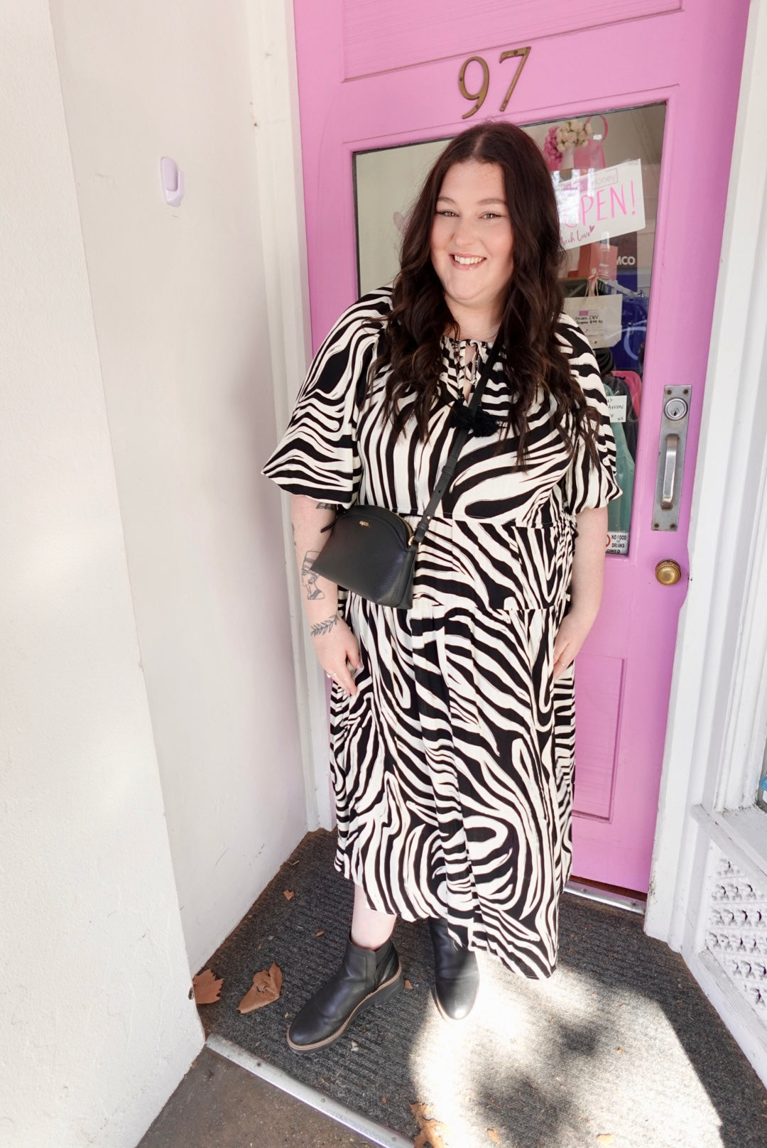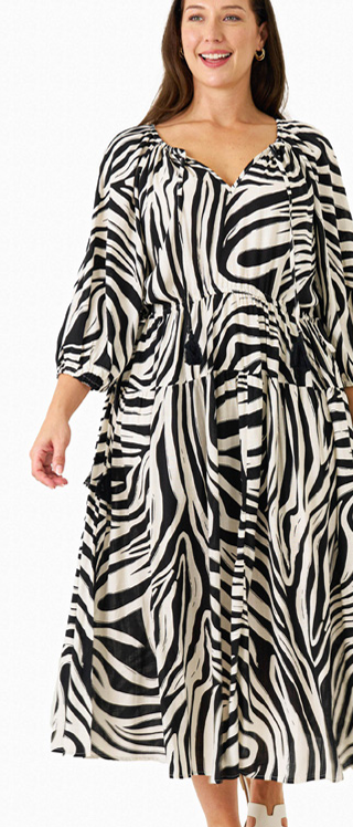 The Darcy Dress is crafted from soft bamboo rayon, offering a luxurious feel and breathable comfort. Featuring a versatile tie-string design, it opens to a flattering v-neckline with elastic for a perfect fit. Elegant tassel details and adjustable tie-strings at both sides of the waist allow you to customize your silhouette. The button-front detail extends to the waist, enhancing its refined look, while long puff sleeves add a touch of sophistication. A seam at the hipline creates a graceful shape. Ideal for layering, this dress pairs beautifully with boots or a cozy jumper for a polished, effortless style. Cold hand wash recommended to maintain its quality.
