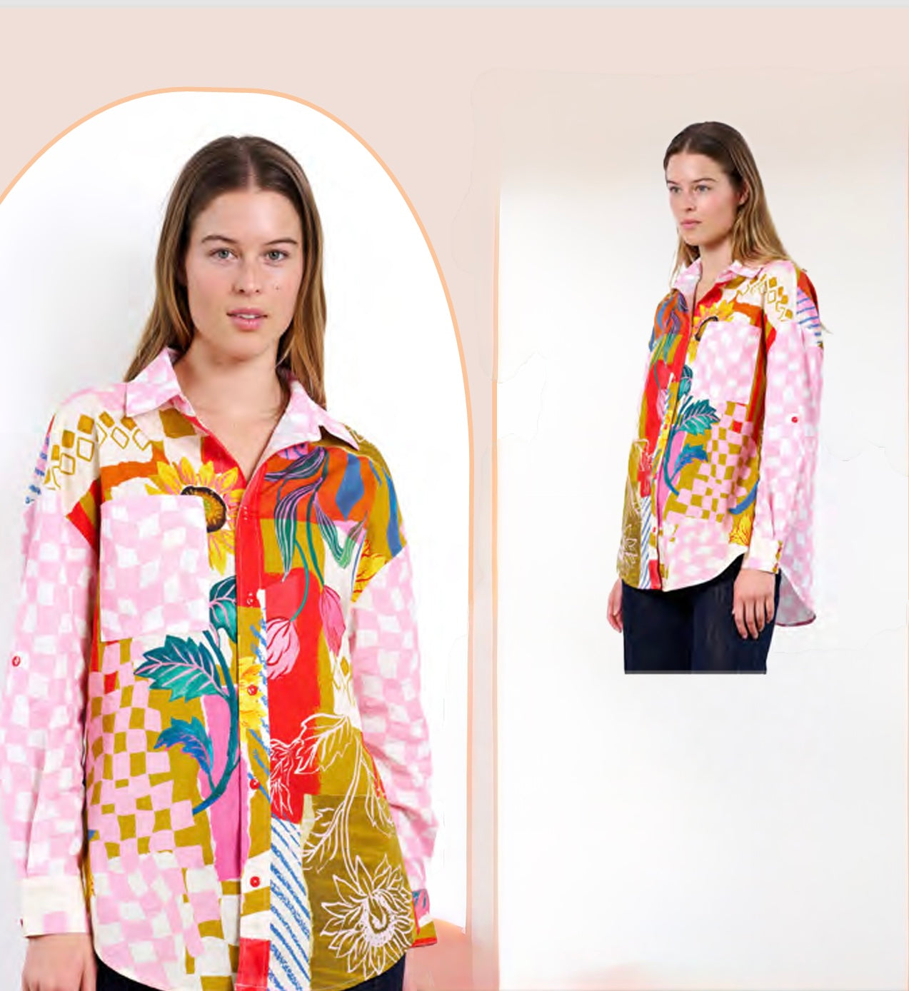 Bright, bold and effortlessly chic — the Galvan Shirt is your go-to statement piece this season. Crafted from breathable pure cotton, it features a striking patchwork floral print in vivid pinks, oranges and greens that bring instant joy to your wardrobe. The relaxed fit and curved hem make it perfect for styling tucked in, knotted, or worn loose over jeans or shorts.